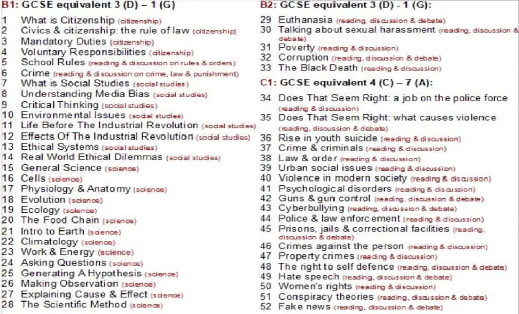 C1 (GCSE equivalent for pupils at levels 7-4): 12. Does That Seem Right: A Job on the Police Force. 13. Does That Seem Right: What Causes Violence. 14. Rise of Youth Suicide. 15. Crime & Criminals. 16. Law & Order. 17. Urban Social Issues. 18. Violence In Modern Society. 19. Psychological Disorders. 20. Guns & Gun Control. 21. Cyberbullying. 22. Police & Law Enforcement. 23. Prison, Jails & Correction Facilities. 24. Crimes Against the Person. 25. Property Crimes. 26. The Right to Self Defence. 27. Hate Speech. 28. Women’s Rights. 29. Conspiracy Theories. 30. Fake News